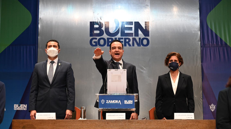 Zamora, Mich. 3 de septiembre.- Secretario del Ayuntamiento Felipe Armando Umaña Melo, Tesorera María Fernanda Garibay Carreón, Presidenta honoraria del DIF Rocío del Carmen Soto Delgado y Karla Eugenia García Sánchez, como directora del sistema DIF, son los funcionarios que integraran la fuerza laboral de este ayuntamiento con la encomienda de hacer un trabajo de manera honesta y responsable, aseguró el presidente municipal Carlos Soto Delgado al tomarles la protesta de ley.